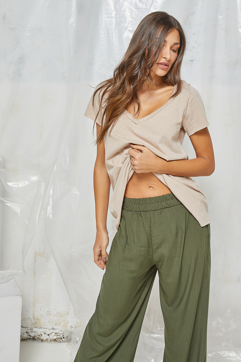 Αυτό το κοντομάνικο T-shirt είναι το απόλυτο basic κομμάτι με χαλαρή γραμμή (loose fit) και βαθιά V-λαιμόκοψη που κολακεύει το ντεκολτέ. Η ανάλαφρη υφή του και το ασύμμετρο τελείωμα το καθιστούν ιδανική επιλογή για καθημερινές και δροσερές εμφανίσεις, συνδυάζοντας άνεση και στυλ.