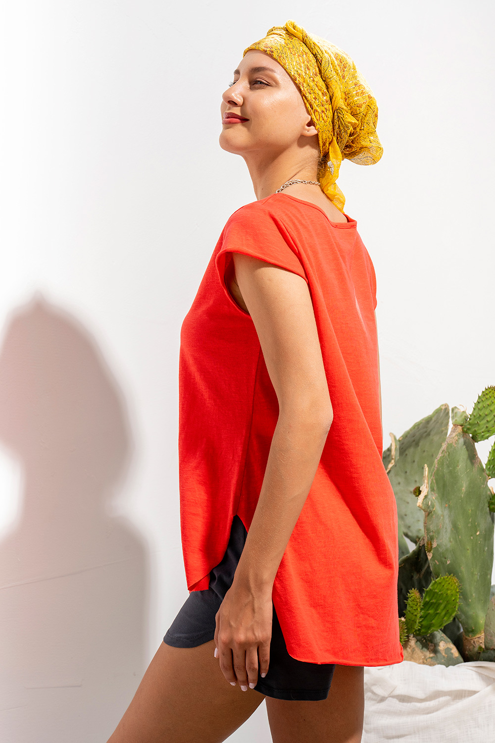 Αυτό το κοντομάνικο T-shirt είναι το απόλυτο basic κομμάτι με χαλαρή γραμμή (loose fit) και βαθιά V-λαιμόκοψη που κολακεύει το ντεκολτέ. Η ανάλαφρη υφή του και το ασύμμετρο τελείωμα το καθιστούν ιδανική επιλογή για καθημερινές και δροσερές εμφανίσεις, συνδυάζοντας άνεση και στυλ.