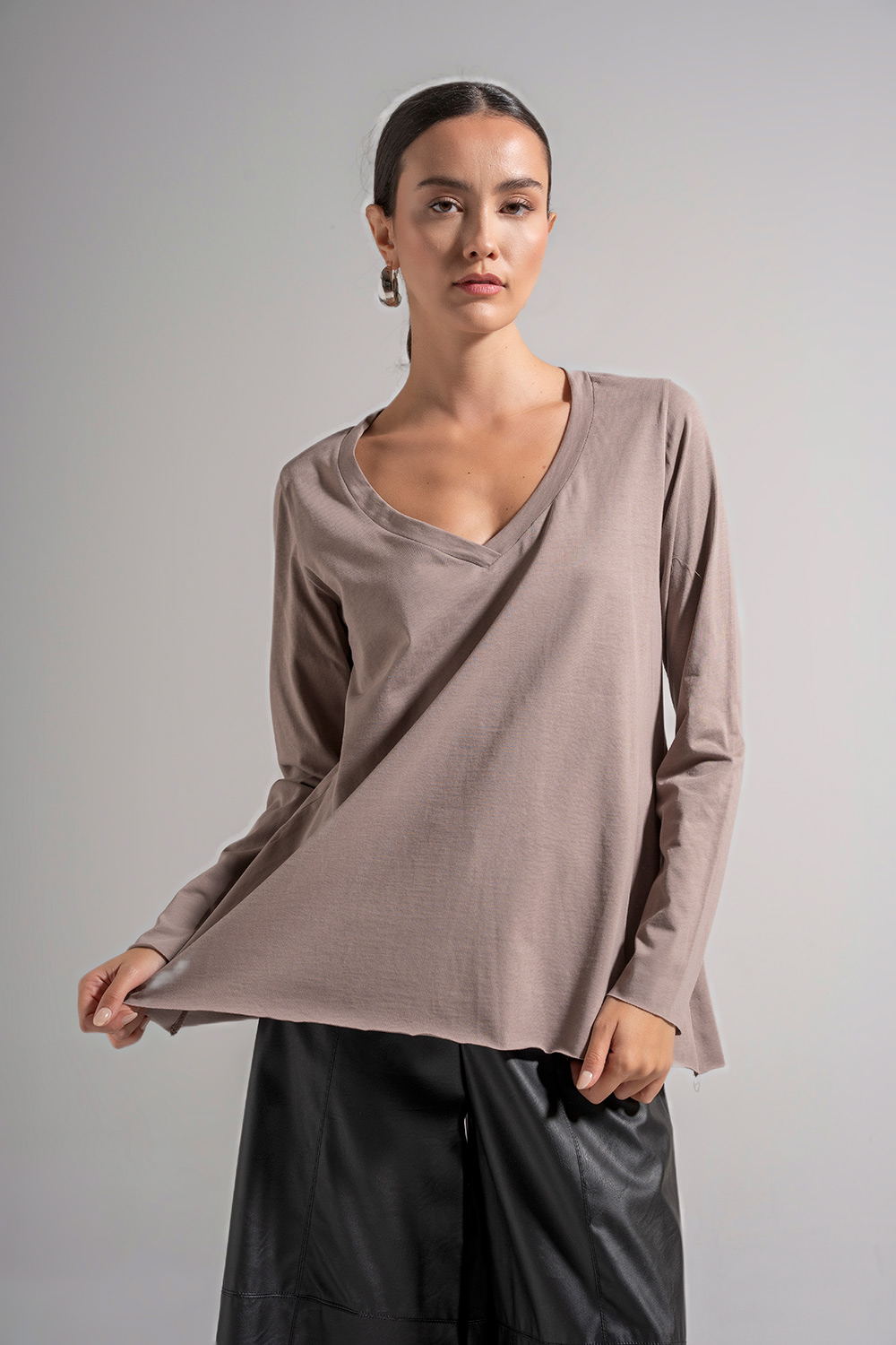 Αυτή η μακρυμάνικη μπλούζα με το βαθύ V ντεκολτέ προσφέρει χαλαρή εφαρμογή και απαλή υφή, καθιστώντας την το ιδανικό basic κομμάτι για casual εμφανίσεις και layering όλο τον χρόνο. Η διαχρονική της γραμμή εξασφαλίζει άνεση και ευελιξία σε κάθε σου στυλ.