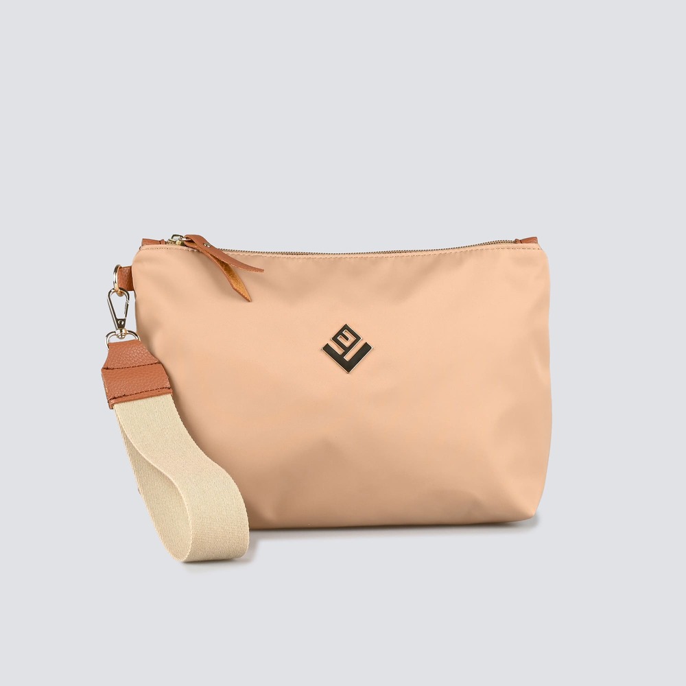 Το εσωτερικό με ανοιχτή γκρι υφασμάτινη φόδρα διαθέτει τσέπη με φερμουάρ για ασφαλή αποθήκευση, ενώ ο υφασμάτινος ιμάντας καρπού εξασφαλίζει άνετο κράτημα. Το κλείσιμο με φερμουάρ ολοκληρώνει τη λειτουργικότητα με διακριτική κομψότητα.